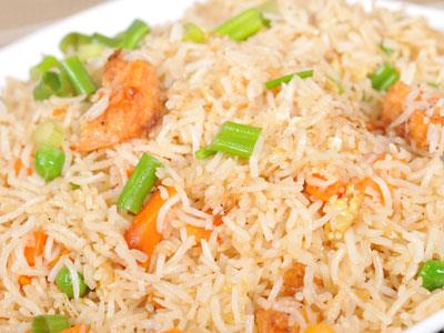 Heat oil in a large, heavy based pan. Add chicken pieces, Soya sauce, garlic water, salt and vinegar, fry for 5 to 7 minutes. Then add chopped shallots, carrots, green pepper and fresh peas, stir for a few minutes. Now add the drained rice carefully, stir for 10 minutes (do not stir too hard otherwise the rice will break). Add 6 cups of water to the rice, cover the rice and lower the heat. Cook for 12-15 minutes until the water has dried and the grains are separated. Mix in the cinnamon and Ajinomoto. Serve hot.